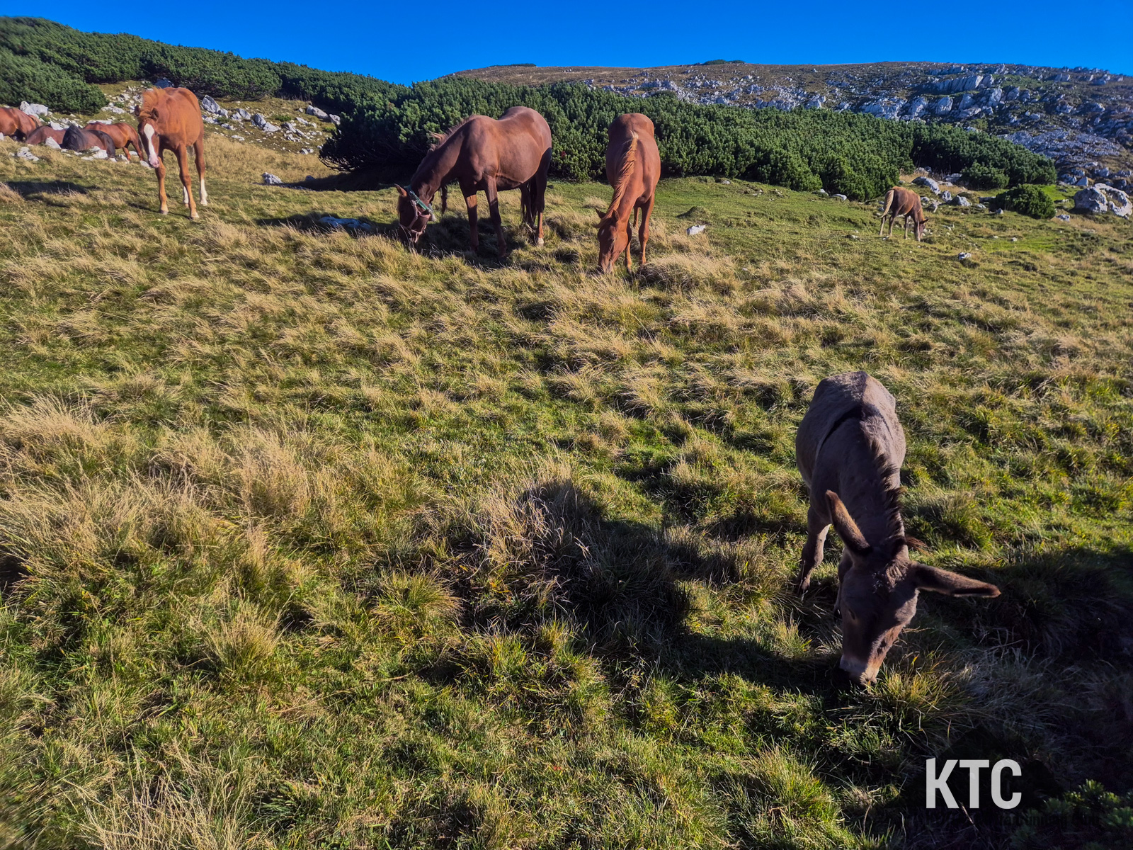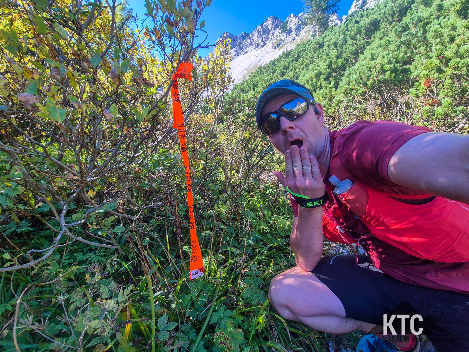 Nach vielen Stunden kam ich dann doch am östlichsten Punkt meiner Route an. Flasks lehr, durstig und hungrig. Und doch sehr viel später als erwartet. Mit einer Stärkung im Bauch und aufgefüllten Flasks machte ich mich auf den Weg mehr oder weniger zurück. Jetzt traf ich dann doch immer wieder mal ein paar Wanderer die auf den gemäßigteren Wegen unterwegs war. Und dann sah ich die erste Markierung des Julian Alps Trail Run... bis knapp vor dem Gipfel des Hochstuhl folgte ich den Fähnchen und Bändern die ich auch vom UTVV kannte. Als ich dann am Hochstuhl war, ging es für mich wieder ziemlich genau der Grenze entlang nach Westen. Der Weg war da doch sehr viel einfacher, aber noch immer mit ettlichen Höhenmeter gespickt. Und ein paar Gipfelkreuze später waren meine Flasks ausgetrunken. Aber kein Problem, da kommt ja bald eine Hütte laut Karte und außerdem sinds ja nur mehr so 10 oder 15km. Auf diesem Abschnitt traf ich dann auch noch auf eine Herde von Pferden und Eseln. Denen hat es auf gut 2000m auch sichtlich sehr gut gefallen. Die liesen sich nicht sonderlich von mir beirren und haben weiter gegrast als ich vorbei bin. Meine Route führte dann auch immer wieder auf der Julian Alps Strecke, bis hin zur besagten Hütte. Tjo, aber da die bitter Enttäuschung: ein paar Gebäude, keine Bewirtschaftung und vorallem kein Wasser. Das war sehr bitter. Aber was solls. Eh nur mehr ein Anstieg, etwas den Grat entland und dann ein gemütlicher Downhill... Aber was soll ich sagen: es war dann ein satter Anstieg, ein Grat mit quasi keinem Weg, ein prachtvoller Sonnenuntergang und ein Downhill der in der Dunkelheit geprägt war von erneutem Wegsuchen. Diese Wegsuche war aber ungemein schwieriger, weil es im steilen Gelände war - ein paar Meter höher under tiefer machen da enorm viel aus um eine Pfad zu finden oder auch nicht. Und ich muss leider eingestehen: ohne Wasser funktioniert das mit den Gels oder Riegeln auch nicht. Entsprechend knapp war es mit dem Energienachschub und der Tag war ohnehin schon lang. Aber ja, ich war am richtigen, geplanten Weg immer wieder mal war er sogar laufbar und irgenwann nach 4 oder 5 Stunden ohne Wasser - ja, das waren nur 10 bis 15km - war da auch ein Bach und dann noch ein paar Hundert Meter zum Ausgangspunkt der Tour.