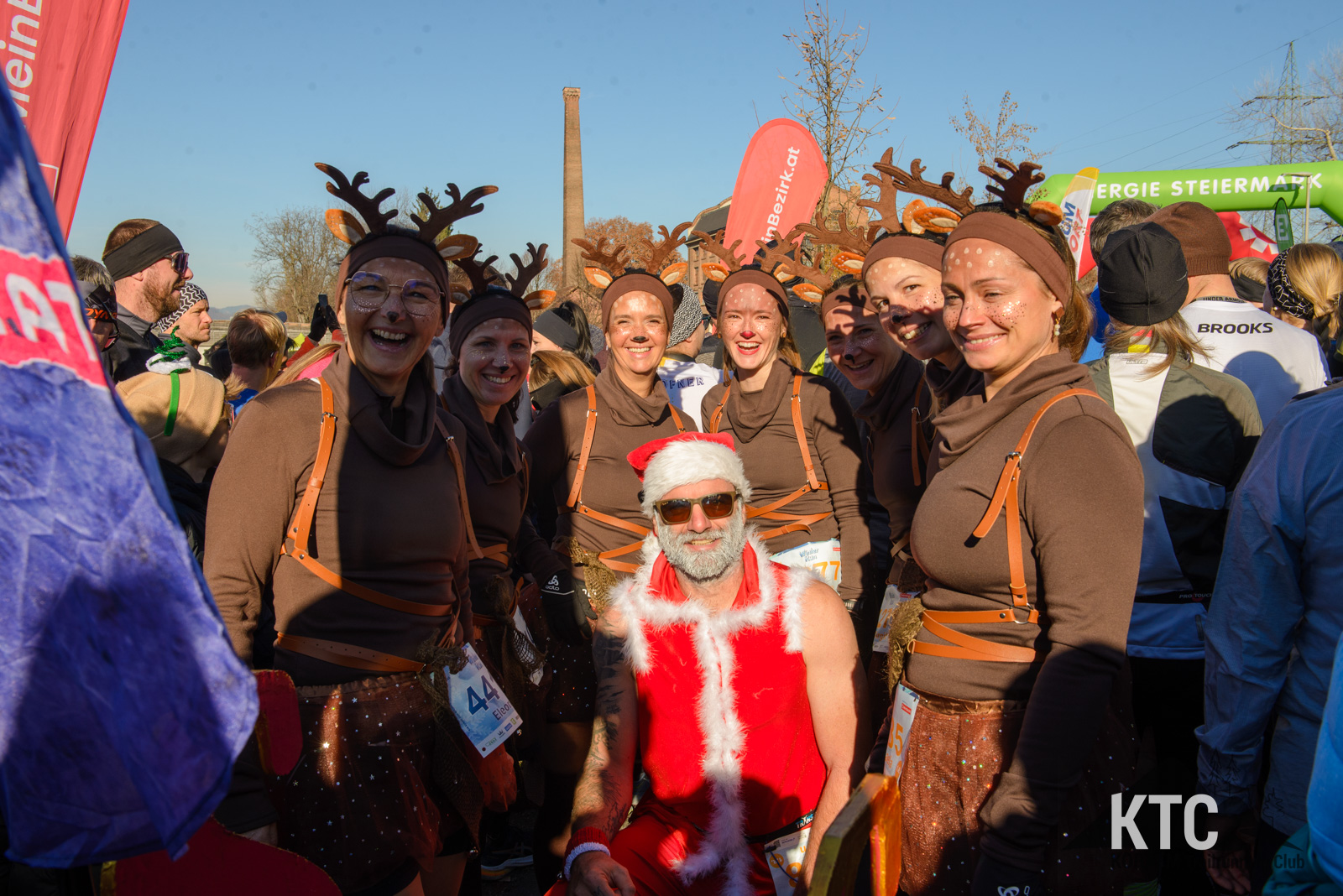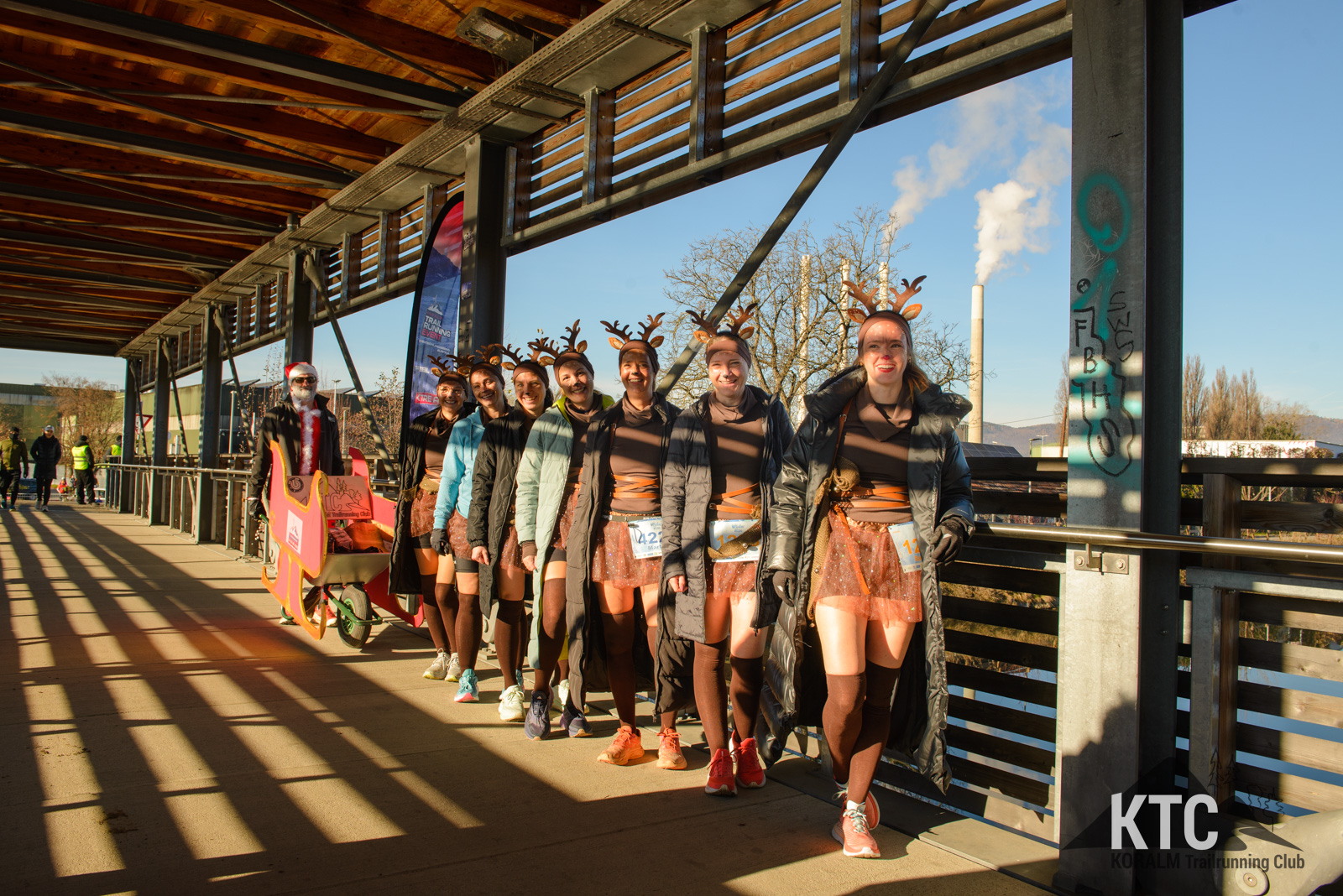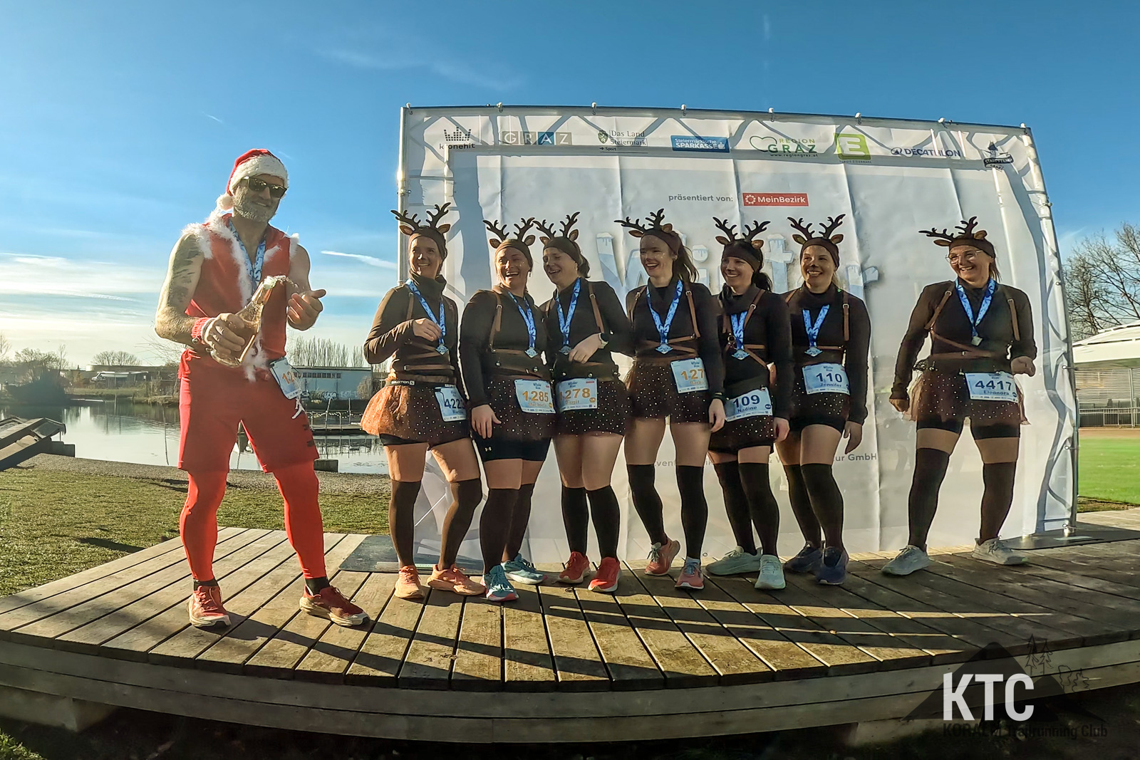 Barbara Frieß, Martina Brunner, Birgit Natter, Nadine Tomberger, Jennifer Lampl, Eleonore Fabian und Michaela Koch traten als fröhliche Rentiere an – komplett mit Hörnern, roter Nase und jeder Menge guter Laune. Gemeinsam zogen sie einen Schlitten, hinter dem kein Geringerer als Jürgen Brunner lief, der als Santa Claus das Schlusslicht der Gruppe bildete. Das weihnachtliche Ensemble verbreitete nicht nur Stimmung, sondern auch eine klare Botschaft: Werbung für den KTRE am 21.+22.08.2026 durfte auf diesem Lauf nicht fehlen.