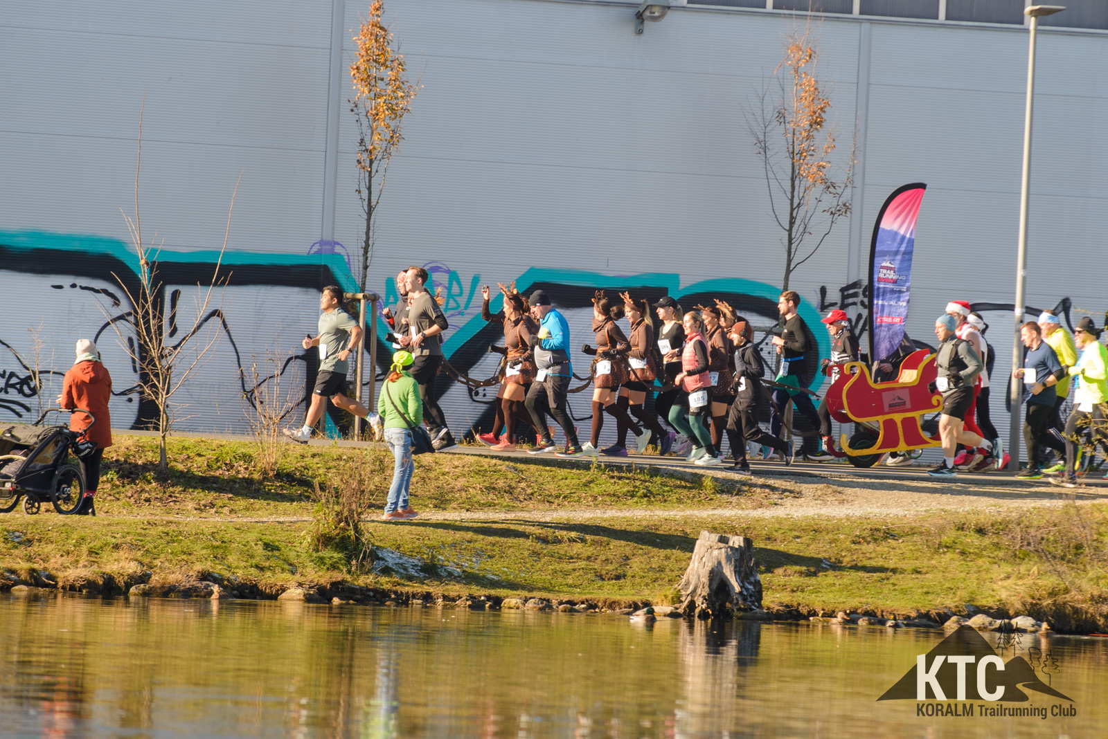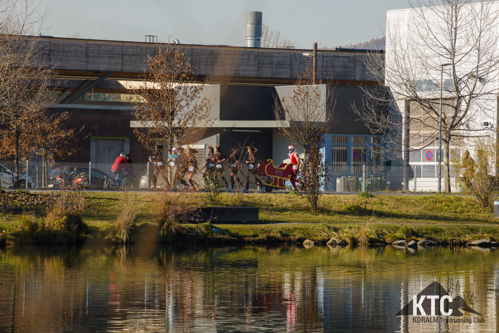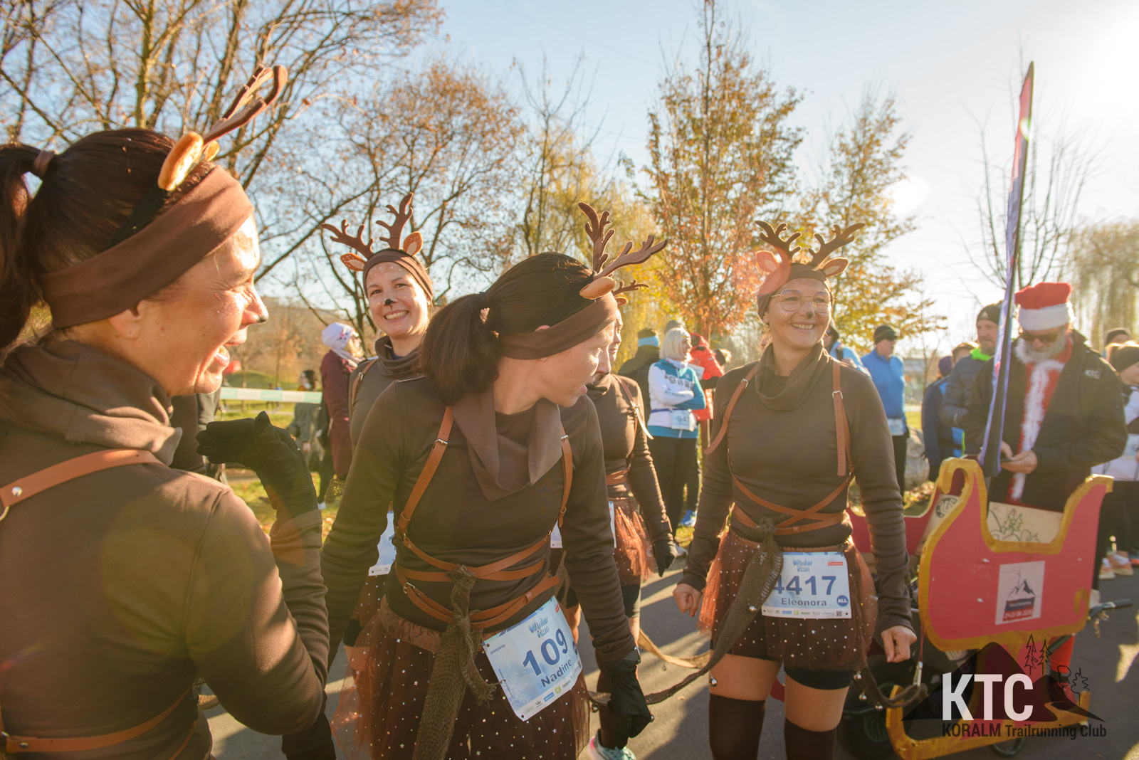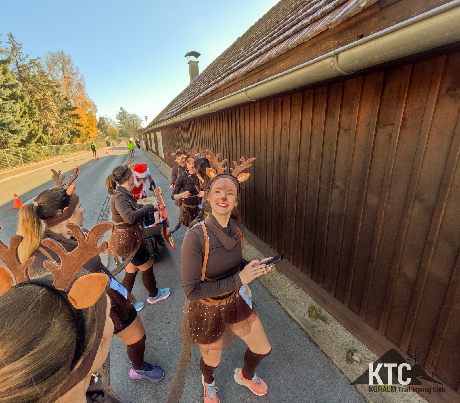 Barbara Frieß, Martina Brunner, Birgit Natter, Nadine Tomberger, Jennifer Lampl, Eleonore Fabian und Michaela Koch traten als fröhliche Rentiere an – komplett mit Hörnern, roter Nase und jeder Menge guter Laune. Gemeinsam zogen sie einen Schlitten, hinter dem kein Geringerer als Jürgen Brunner lief, der als Santa Claus das Schlusslicht der Gruppe bildete. Das weihnachtliche Ensemble verbreitete nicht nur Stimmung, sondern auch eine klare Botschaft: Werbung für den KTRE am 21.+22.08.2026 durfte auf diesem Lauf nicht fehlen.