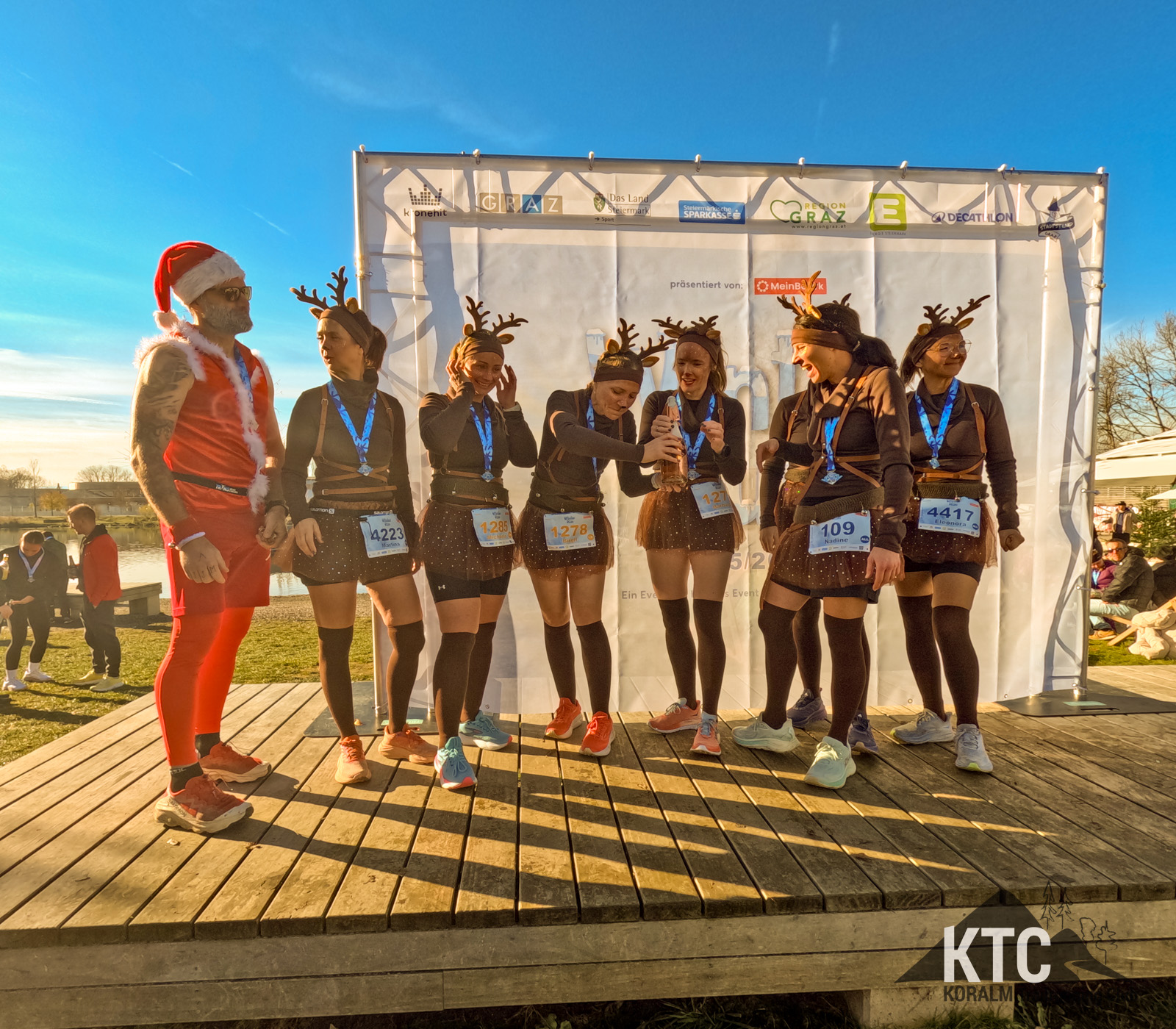 Nach der offiziellen Siegerehrung der schnellsten Athletinnen und Athleten wartete eine ganz besondere Überraschung: Für die originellste Verkleidung gab es eine zusätzliche Ehrung - die ganz spontan organisiert wurde -, bei der unsere Rentiere im Mittelpunkt standen. Der Preis – eine Flasche Prosecco – wurde selbstverständlich gleich im Anschluss mit Freude und Teamgeist genossen.