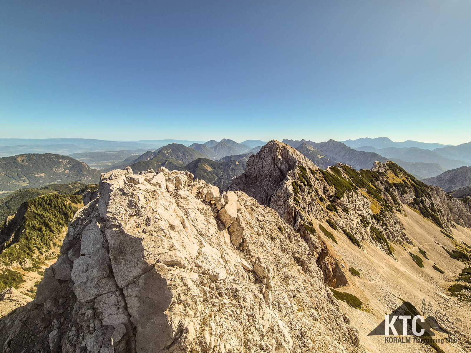 Von Laufen war dort allerdings nicht mehr viel übrig - das war im Bestenfall eine technische Wanderung bis Kletterei und stetiger Wegsuche. Der elektronische Helfer am Handgelenk versicherte aber immer wieder auf dem Weg zu sein. Außerdem waren doch immer wieder Latschen ausgeschnitten und somit soetwas wie ein Weg erkennbar - für einige Meter. Mehrere Gipfelkreuze konnte ich auf dem wirklich schwierigen, ausgesetzten Weg erklimmen und immer wieder die atemberaubende Fernsicht in alle Richtungen geniesen. Speikkogel, Großglockner, Triglav.. alles war dabei und noch viel mehr, was ich aber ob meiner bescheidenen Kenntnisse nicht bennen konnte.